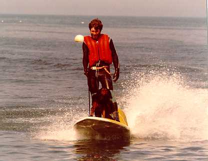 If you can make this out, it's me and my dog, Brandy, surfing the sea at Dunmore East, Co.Waterford, Ireland, about eleven years ago. The surf-jet (an American invention) is powered by a 15 horse-power two stroke engine, and can whizz along at 30 MPH. For Brandy this was the best way to chase seagulls! Sadly he was also fond of chasing sheep, and was put down sometime afterwards, while I was away on an offshore trip.
